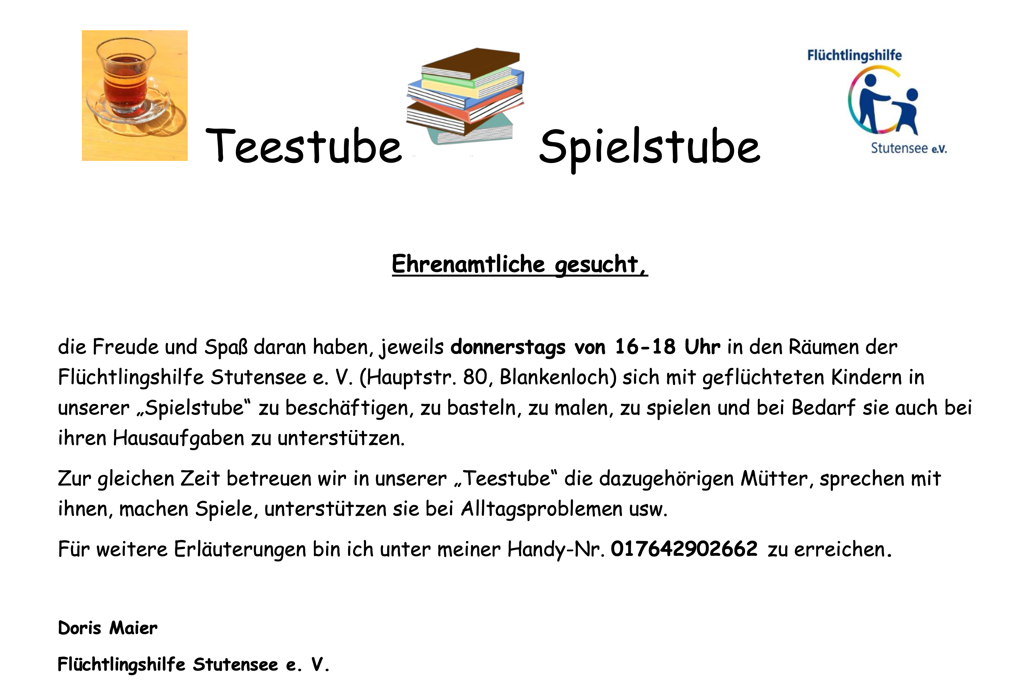 die Freude und Spaß daran haben, jeweils donnerstags von 16-18 Uhr in den Räumen der Flüchtlingshilfe Stutensee e. V. (Hauptstr. 80, Blankenloch) sich mit geflüchteten Kindern in unserer „Spielstube“ zu beschäftigen, zu basteln, zu malen, zu spielen und bei Bedarf sie auch bei ihren Hausaufgaben zu unterstützen.